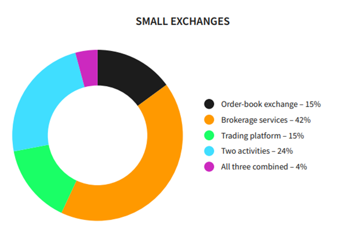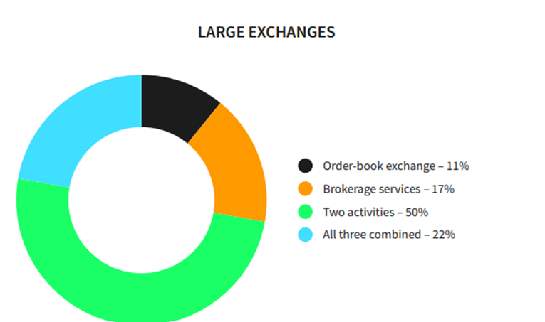 • Exchange services/activities fall into three categories: order-book exchanges, brokerage services and trading platforms while 72% of small exchanges specialize in one type of exchange activity (brokerage services being the most widely offered), while the same percentage of large exchanges are providing multiple exchange activities.